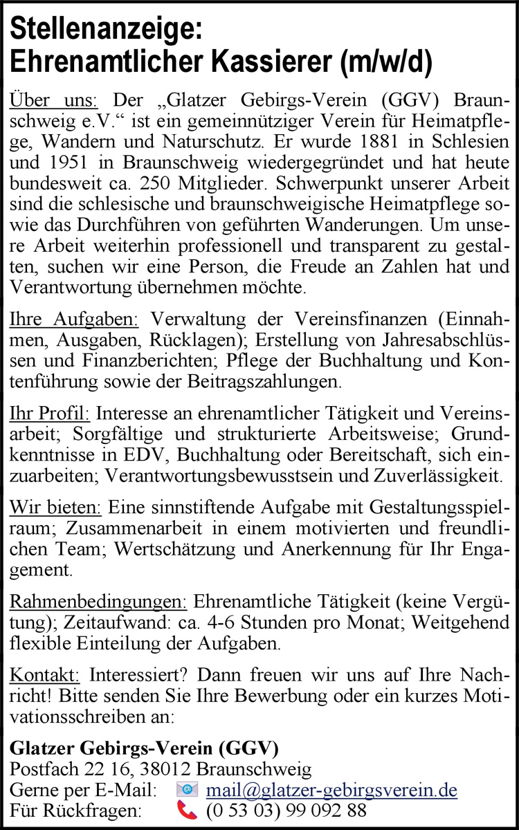 Auch werden vom GGV die deutsch-polnischen Beziehungen durch Kontakte und Besuche in der „alten“ schlesischen Heimat Grafschaft Glatz (heutiges Polen) gepflegt. Mitglied im GGV zu sein beudeutet: die Gemeinschaft von Heimatfreunden und Wanderbegeisterten zu erleben und gemeinsam die Schönheiten des Braunschweiger Landes und der norddeutschen Mittelgebirge zu erkunden. Werft gerne mal einen Blick auf die Website: www.glatzer-gebirgsverein.de